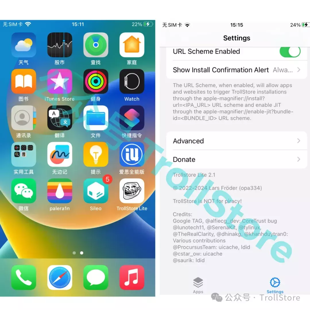 点击获取以后返回桌面就可以看到越狱版的TrollStore 了,打开它即可使用,和免越狱的一样。越狱版的TrollStore 和越狱是绑定一起的,因为现在没有完美越狱,一旦你手机关机重启以后需要再次越狱,所以这也是越狱的弊端!关机重启以后需要再次越狱TrollStore 才会出现!这个没办法!我尝试在Sileo安装trollhelper 用它安装TrollStore ,把持久性助手植入提示,关机重启!本想着不越狱的情况打开提示刷新一下打开TrollStore ,没想到提示直接闪退无法打开,所以没办法关机重启必须再次越狱!
