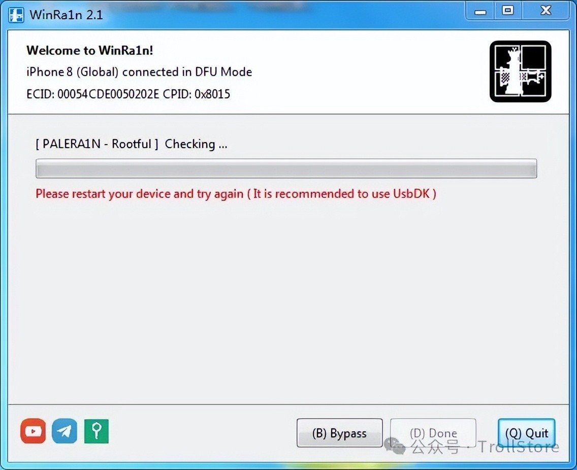 如果出现,Please restart your device and try again (It is recommended to use UsbDK)报错,但是手机是黑屏,你就把数据线拔了,重新插上去试一试!这里手机虽然是黑屏,但是它仍然是DFU模式,你可以按照以上步骤多尝试一下。