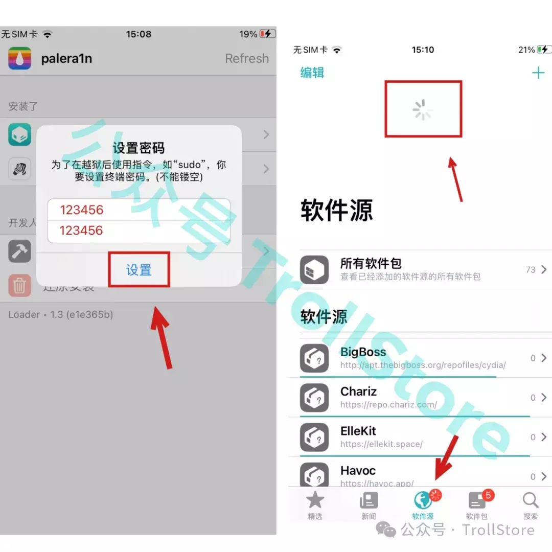 它会弹出来设置密码,这里我们两个都输入123456就行了!然后点击设置!返回手机桌面可以看到 Sileo 越狱商店已经安装好了,我们打开它,点击底部软件源,手指往下拉刷新一下,如上右图所示。