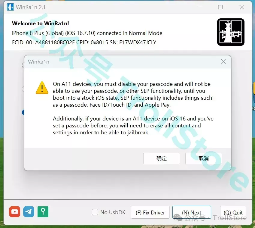 我们先在文末用电脑下载好越狱工具winra1n 2.1 ,打开winra1n 2.1,手机插上数据线连接电脑,点击Paleran 2.0.0 beta 7/8 ,选择Rootless (8),点击(N) Next !这里可以看到,checkra1n 支持[A9-A11, iOS15-iOS17]越狱,当然如果你的系统是iOS 16.6.1以下,包括16.6.1就没必要使用这款工具越狱安装。因为你可以直接使用TrollnstallerX安装TrollStore 无需越狱。