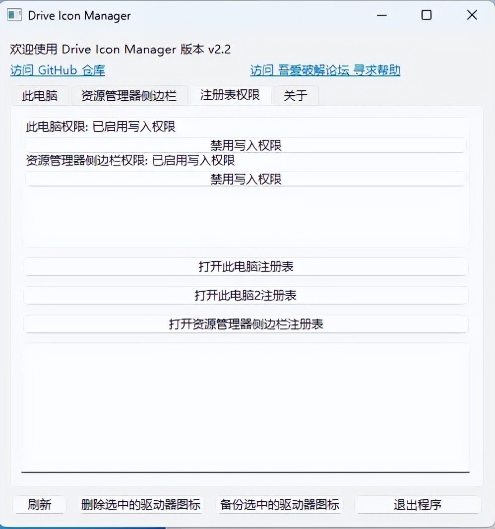 就有大佬制作了这么一款小工具,支持一键删除资源管理器图标,还可以一键锁定注册表,使图标不再复发,彻底解决所有潜在的隐患。