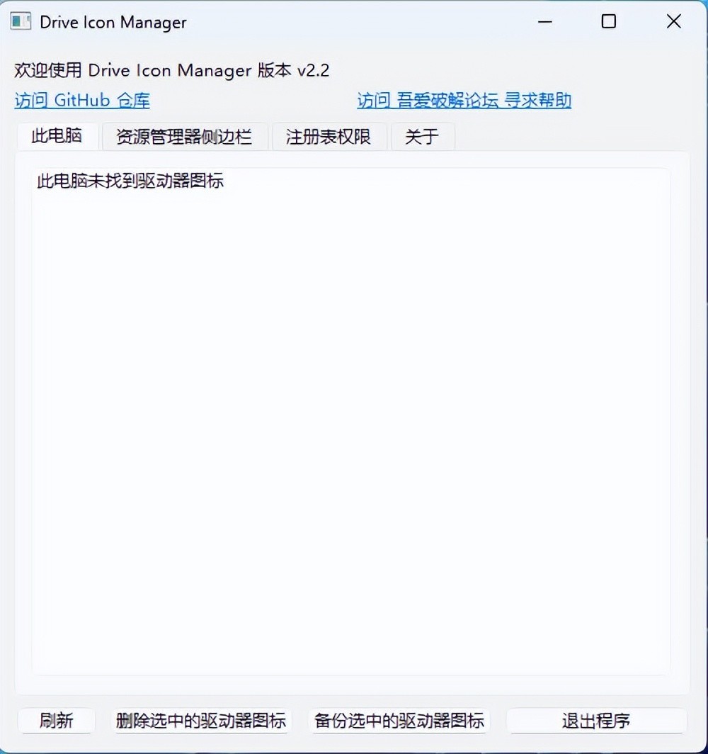 这款 Drive Icon Manager 软件十分简单,单文件运行,打开就能看到当前计算机驱动器图标情况,选择需要删除的图标,软件最下方有删除图标的按钮。