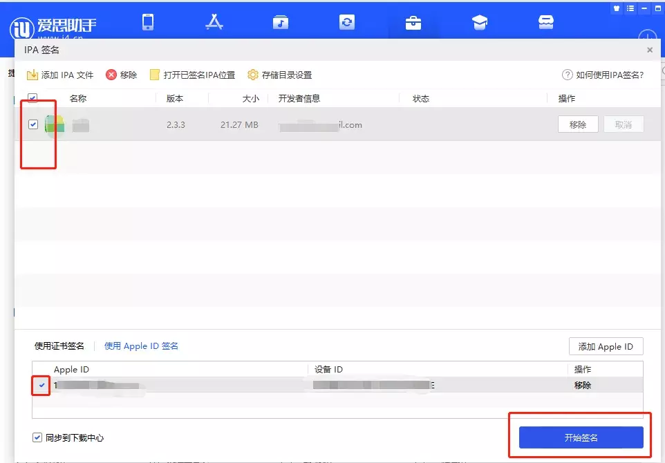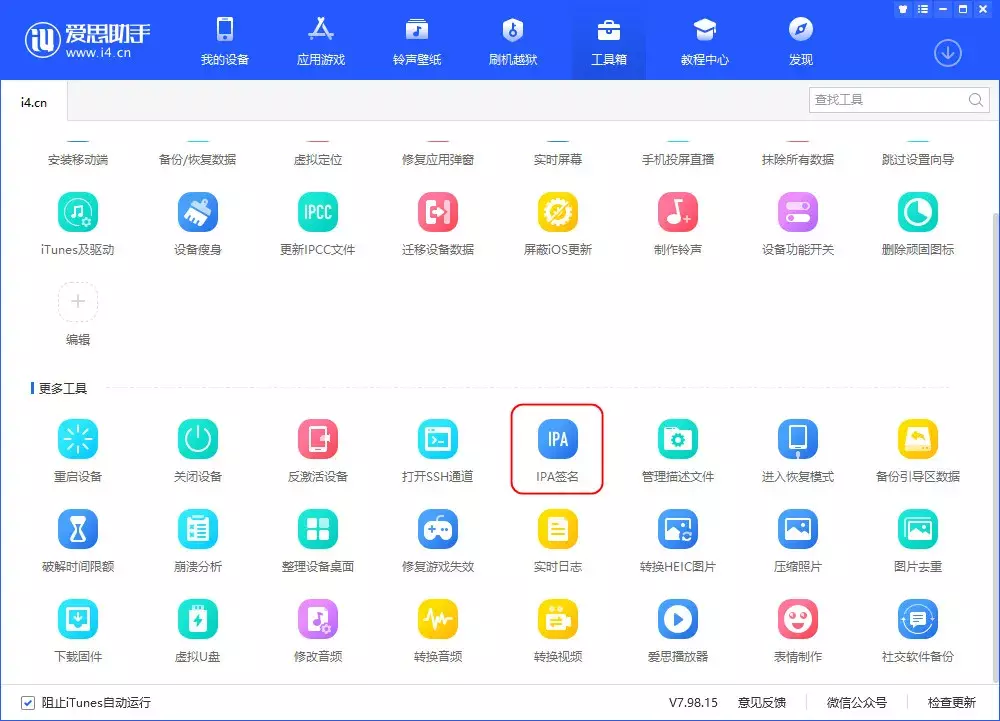 爱思助手官网已经有详细的教程,有些同学可能不会注意去看,爱思助手新版的签名工具在爱思助手–工具箱–ipa签名,我们只说下自签的方法。