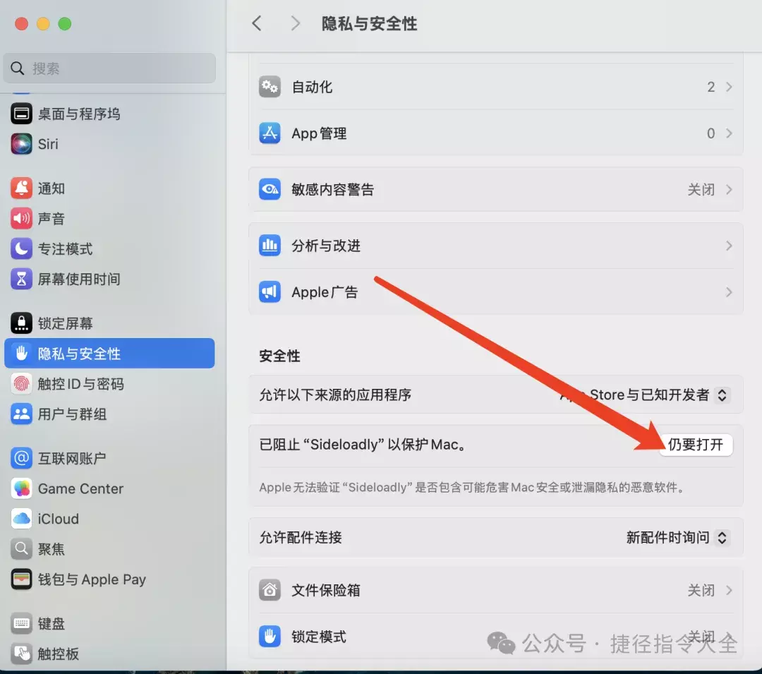 下载Sideloadly安装包到你的电脑上并且安装它,macOS系统安装后如果提示隐私阻止安装就在设置中打开.