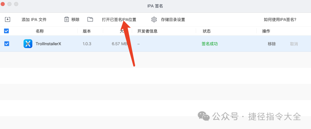 签名成功成功后,点击 已签名的ipa位置,点击应用,点击导入安装