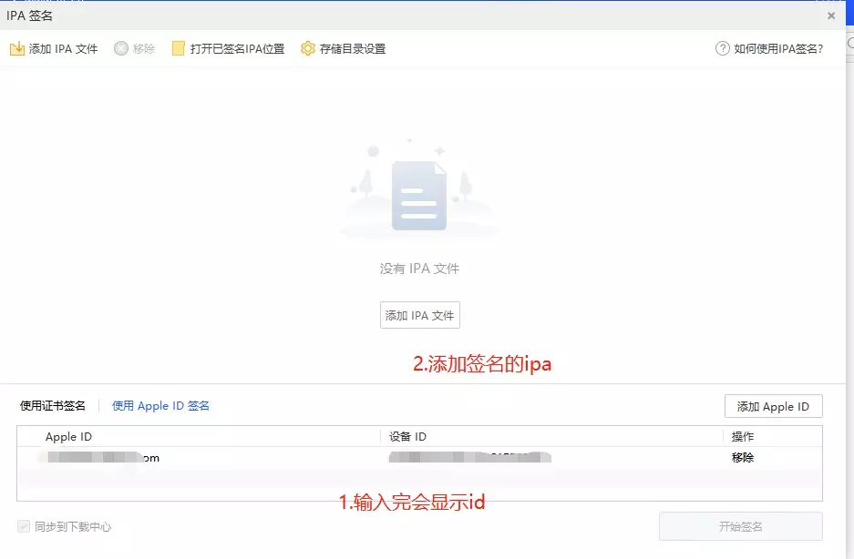 添加完id会显示到最底部,这个时候你可以点击添加ipa文件,从本地文件夹里选择你要签名的软件。