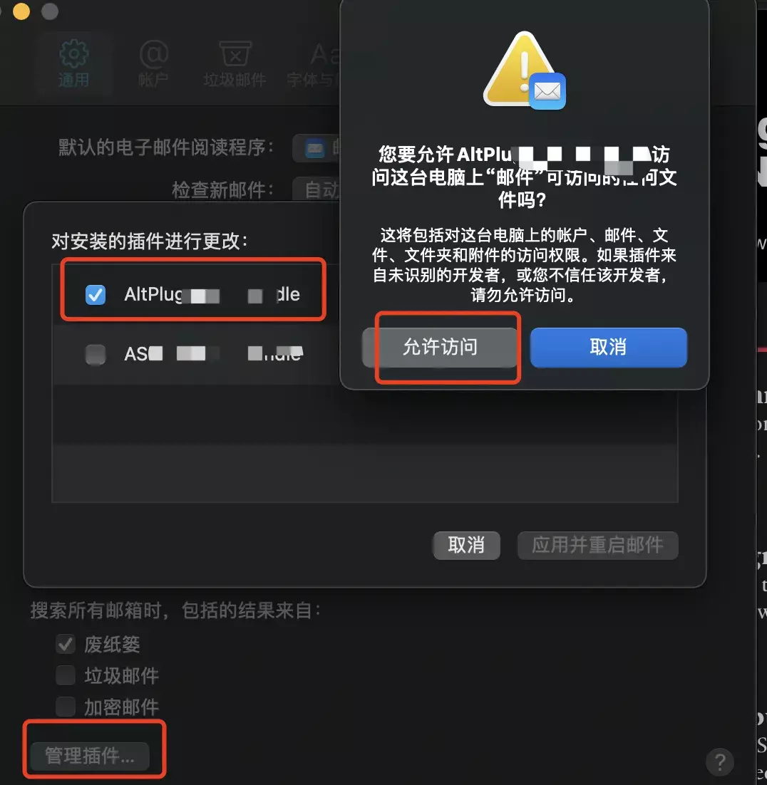 如果提示以上内容,打开本地邮件,点击邮件–偏好设置–管理插件,信任这个插件打勾并且重启一下邮件,再回到上一步填入Apple ID等待 altstore 安装到你的手机上,