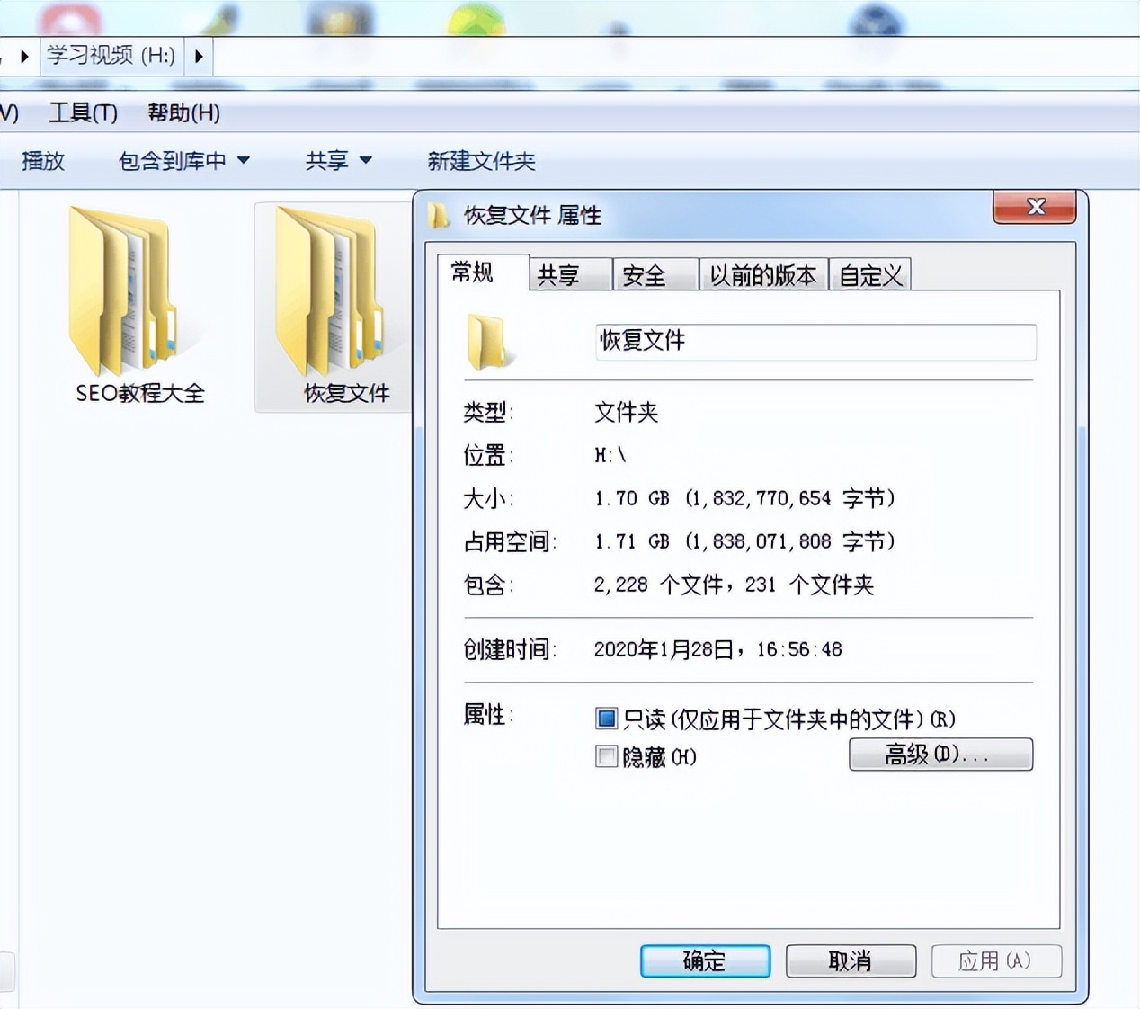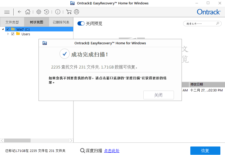 等待数秒钟后,扫描结束了。我们看到窗口显示查找文件数2235,查找231个文件夹,有1.71GB数据可恢复。没想到居然有这么多。