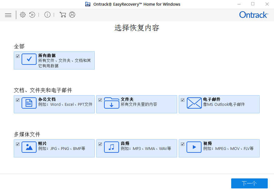 第一步,我们选择需要恢复的文件类型。假如你需要恢复所有类型的文件,就可以毫不犹豫地选择所有数据选项,这样就会默认勾选上所有文件类型,然后点击右下角的下一个。