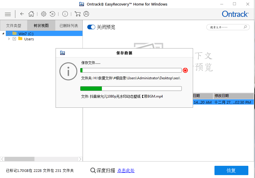 第四步,我们就要在文件恢复软件扫描出来的删除文件中搜寻我们想要恢复的文件了。在左侧列的上方,我们可以选择文件类型、树状视图以及已删除列表。可以说是考虑非常周到了。假如没有详细的分类,在文件堆中寻找特定文件无异于大海捞针。如果需要寻找图像类文件,右上方还有预览窗口,如果不需要,可以将它关闭。