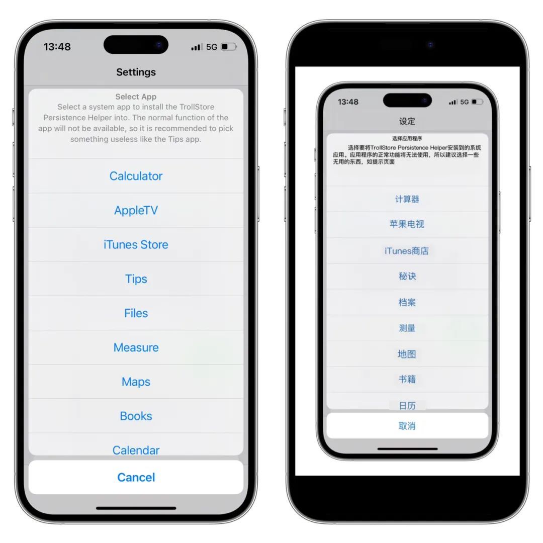 选择要将TrolStore Persistence Helber安装到的系统应用。应用程序的正常功能将无法使用,所以建议选择一些无用的东西,如提示页面