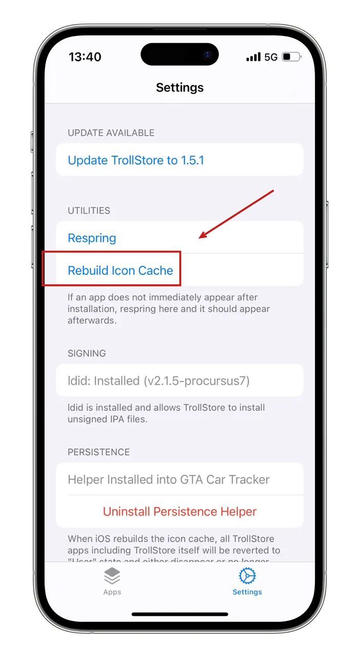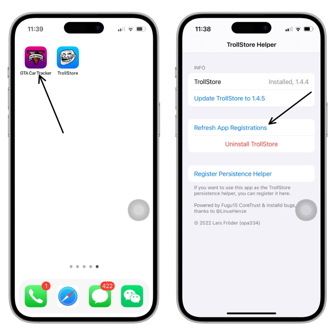 当iOS重建图标缓存时,包括TrollStore本身在内的所有TrollStore应用程序将恢复为“用户”状态,要么消失,要么不再启动。如果发生这种情況,您可以使用安装到GTA Car Tracker中的持久性帮助程序来刷新应用程序注册,这将使它们再次工作。