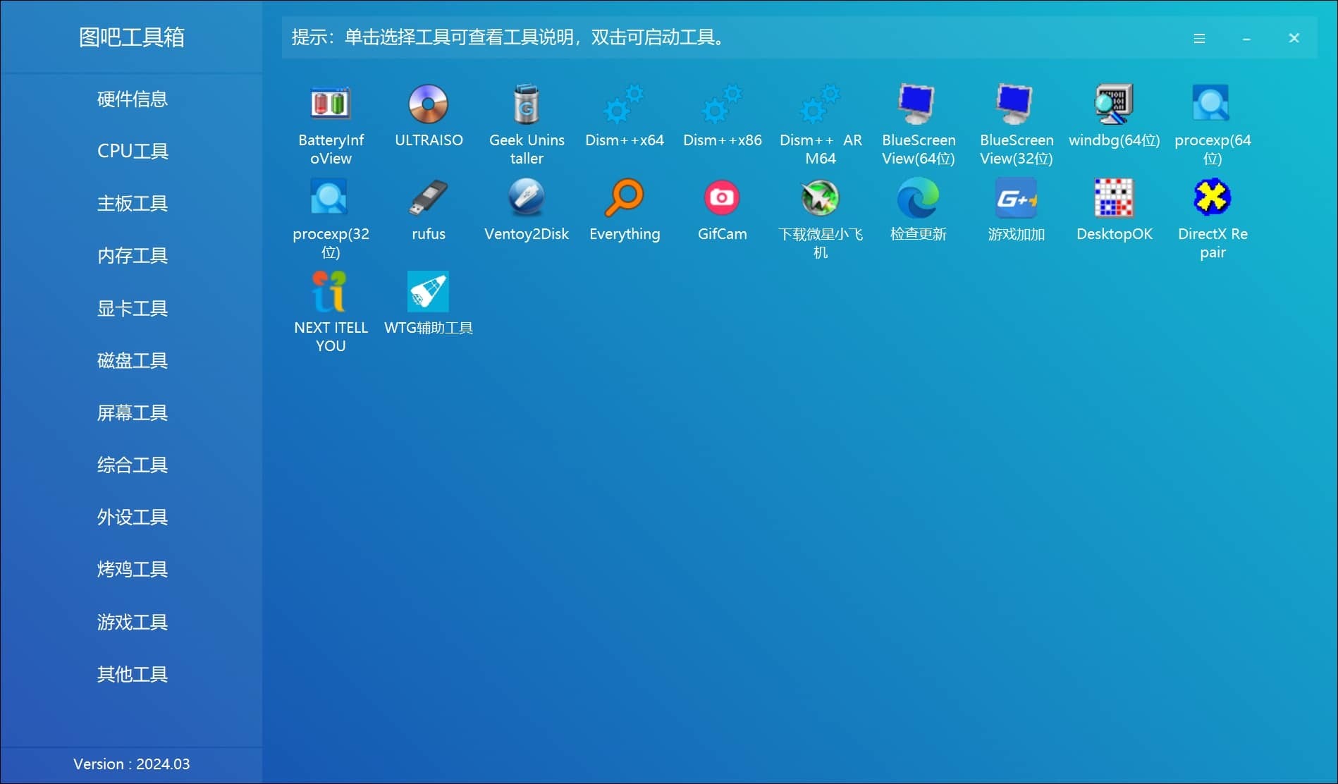 图吧工具箱集成了常用的硬件检测与系统维护等工具,方便图钉使用,工具箱纯绿色无需安装,无广告推广,不会联网不会捆绑或者诱导用户安装任意程序或改变系统设置界面清爽大方,适合保存一份到硬盘或U盘,方便日后使用。