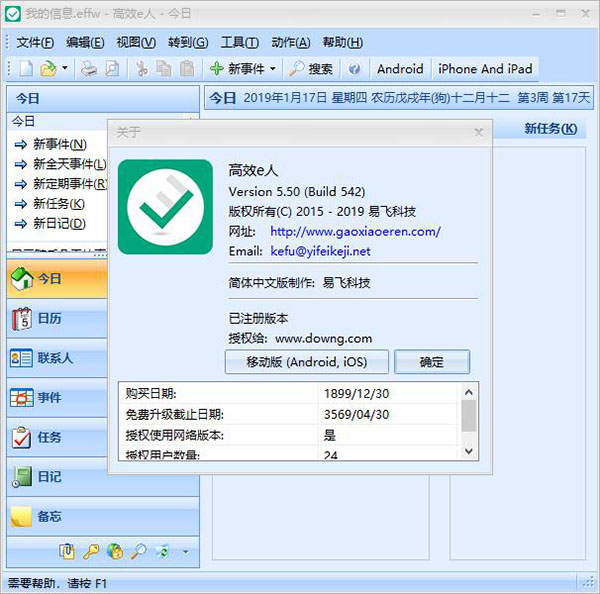 高效e人是集通讯录、日程安排、任务计划、公历农历、电子日记、便笺备忘、密码管理、网址收藏等诸多功能于一身的个人信息管理软件。软件具有集成化的界面,统一的操作方式。您无需分别打开几个不同的程序来管理您的个人事务。