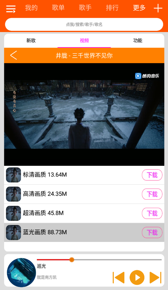 软件同样使用比较简单,可以按照歌单、歌手和排行搜索和播放歌曲。