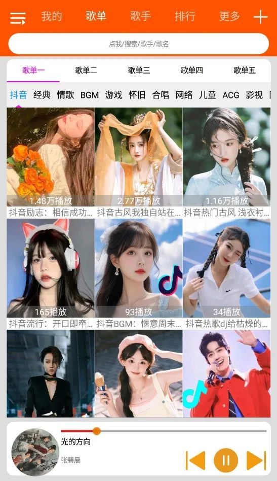 首页又分为三个版块,分别是推荐、歌手和歌单,歌手和歌单版块显示的是不同的分类,支持关键词搜索,支持音乐 mp3 格式本地下载。