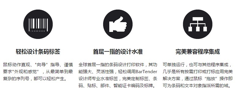 BarTender常用的标签设计功能,包括所有文本、图形、条形码和大多数序列化功能。