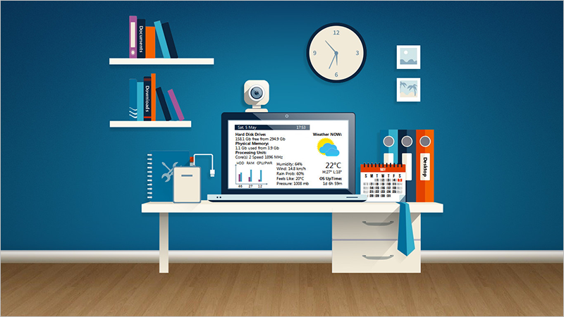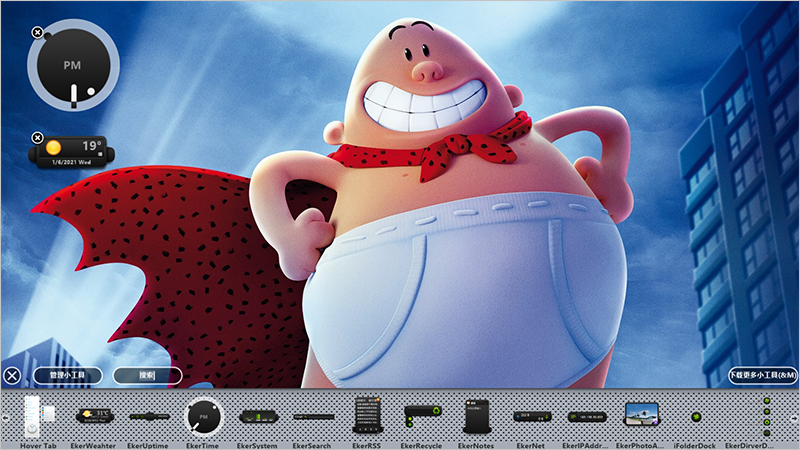 通过套件小工具你可以让桌面风格变得有趣起来,如下图把时钟和天气预报与壁纸无缝融合到了一起。