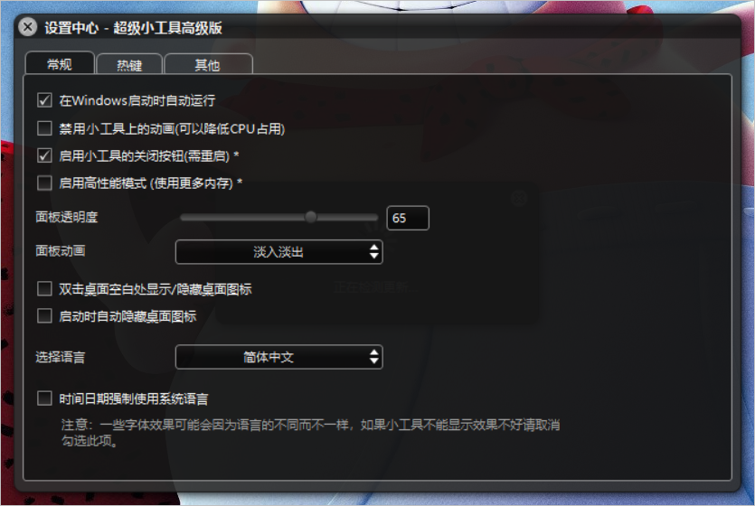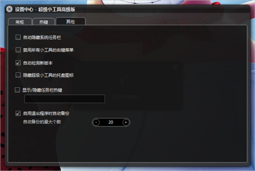 其它功能方面支持面板动画效果设置、快捷键自定义、自动隐藏/显示、自动备份小部件等等。