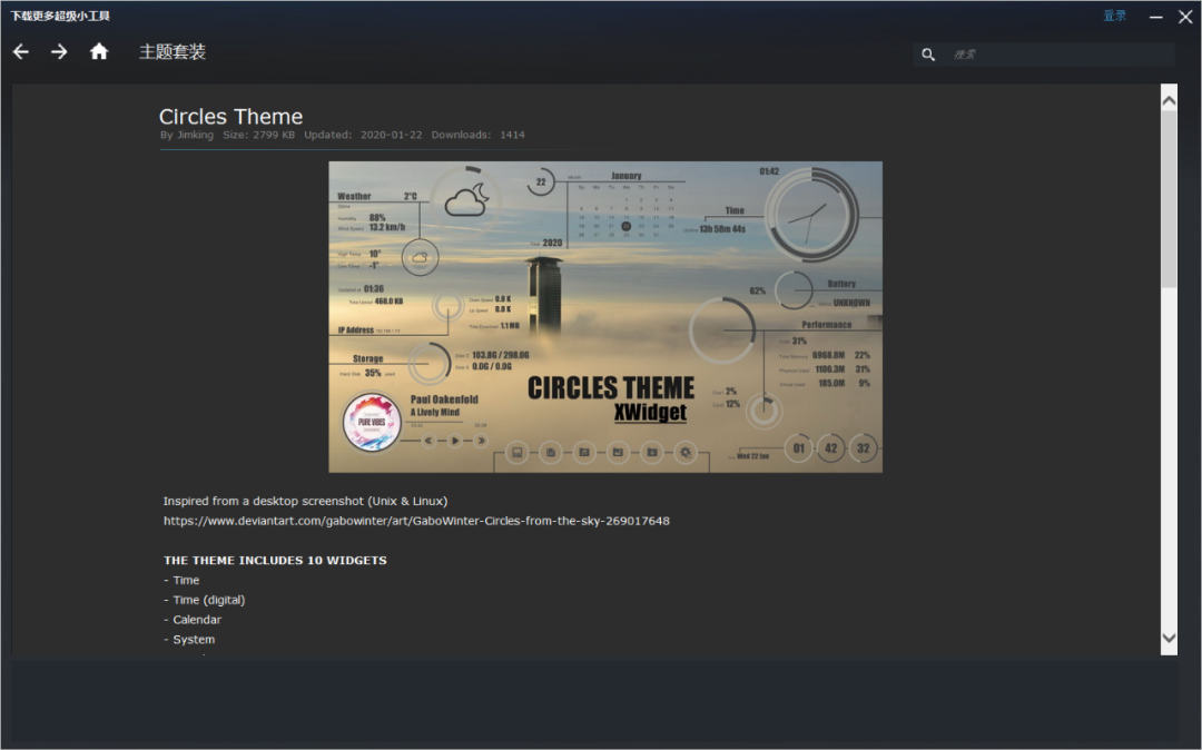 小工具资源库也提供了小工具分类,分别有天气、时钟、信息、媒体、系统状态、以及套件。