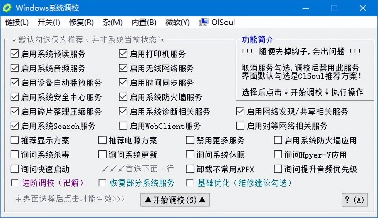 OlSoul是一款能够适配用于win各个系统的系统调校软件,它内置有众多调校功能可以直接使用,比如有启用无线网络功能、启用打印机功能、系统快速休眠与休眠开关、快捷方式小箭头去除功能等等,具体的调校功能多达几十项,可以自由的使用,方便用户对系统更好的调校设置。