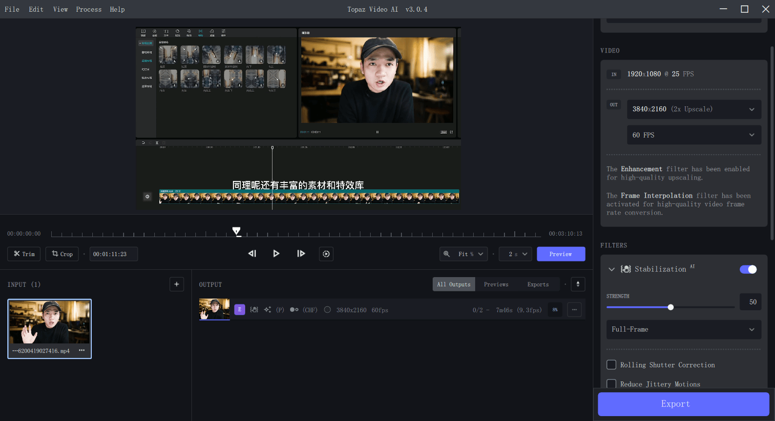 - AI 驱动的抖动稳定 Topaz Video AI的视频稳定模型还处于早期阶段,但在许多情况下仍比行业领导者表现更好。
